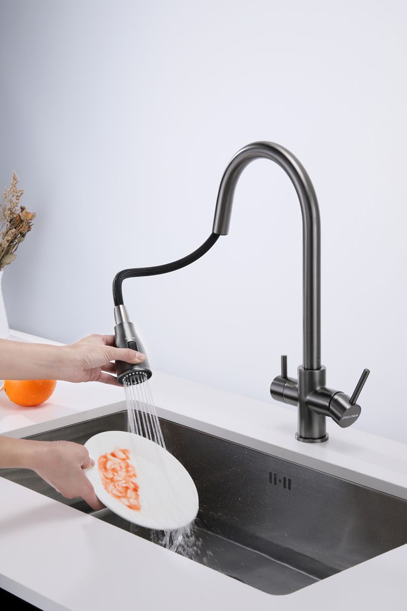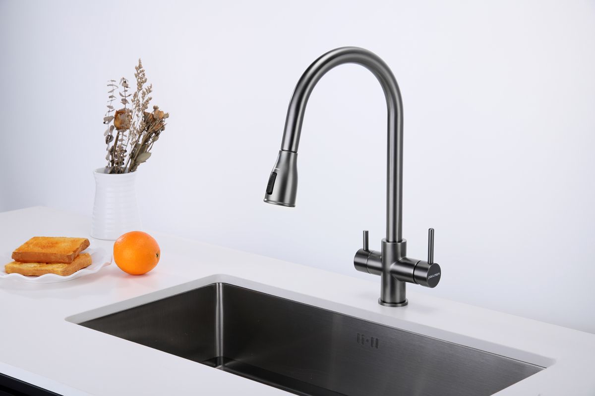 Смеситель под фильтрованную воду с выдвижным шлангом, артикул La214212-GMИзготовлен из высококачественной латуни, которая отвечает высочайшим европейским стандартам качества, не содержит свинца, не разрушается со временем и безопасна для здоровья.Вытяжной шланг