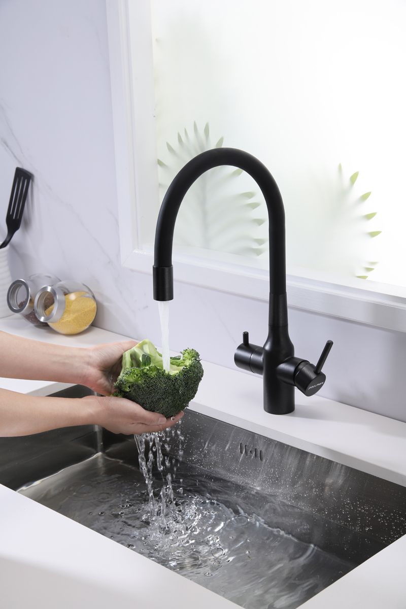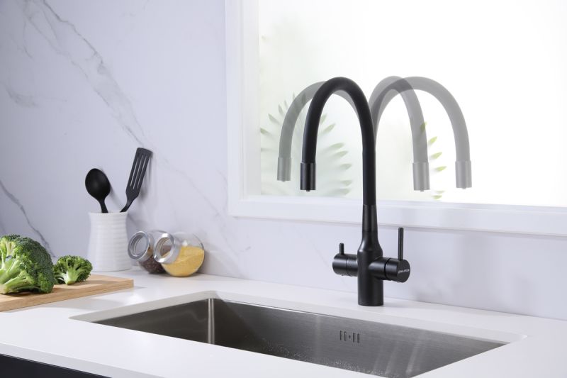 Смеситель под фильтр с гибким изливом, артикул Sa213419-418Смеситель для кухни с возможностью подключения фильтра питьевой воды, эластичный излив с фиксацией.