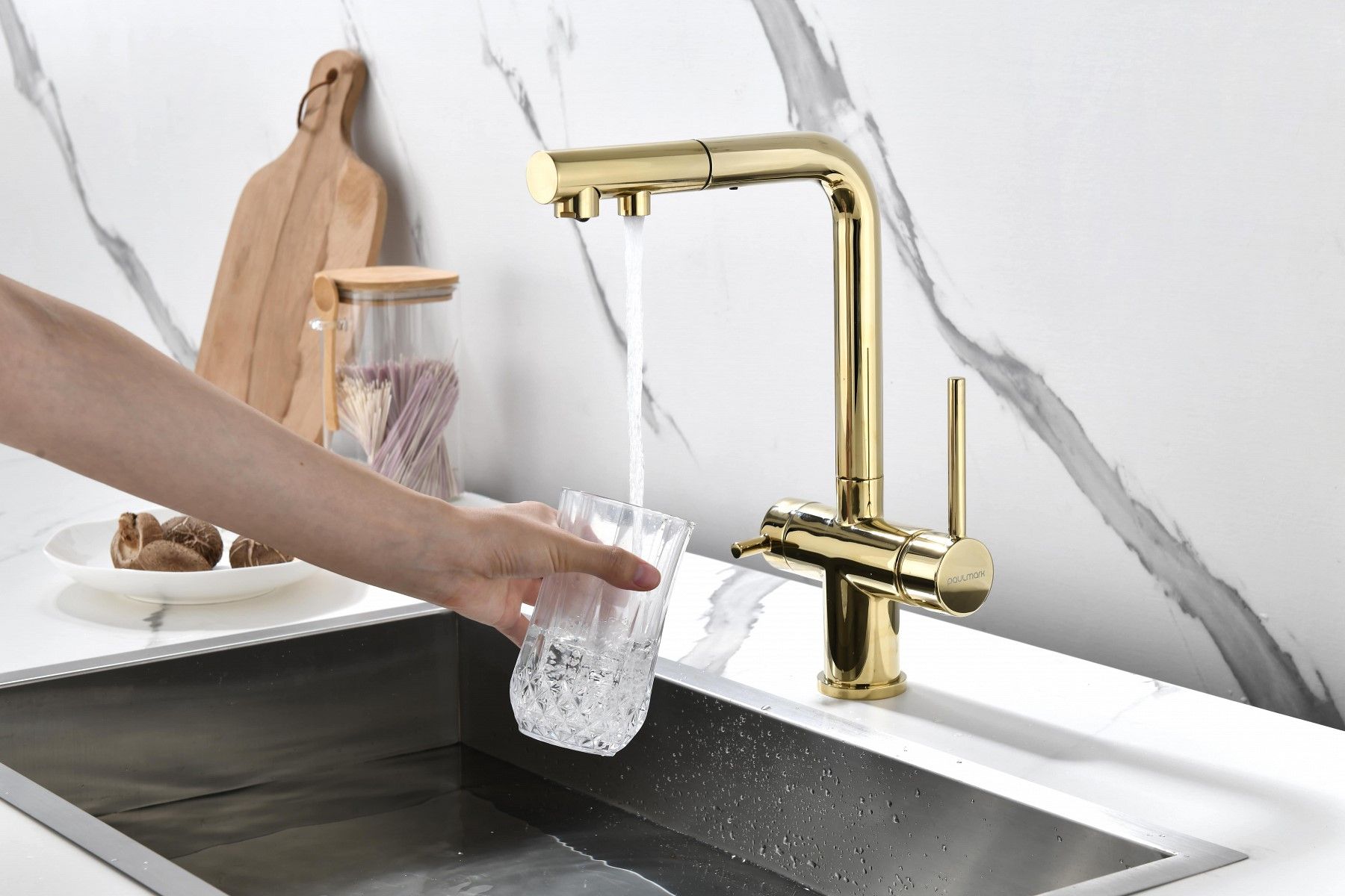 SERPENTINE оснащён функцией TRINKWASSER - излив смесителя имеет встроенный независимый канал для питьевой воды из фильтра, таким образом питьевая и водопроводная вода не смешиваются. Управление питьевой водой осуществляется отдельным рычагом, расположенным слева. Для пуска водопроводной воды используется большой рычаг справа.