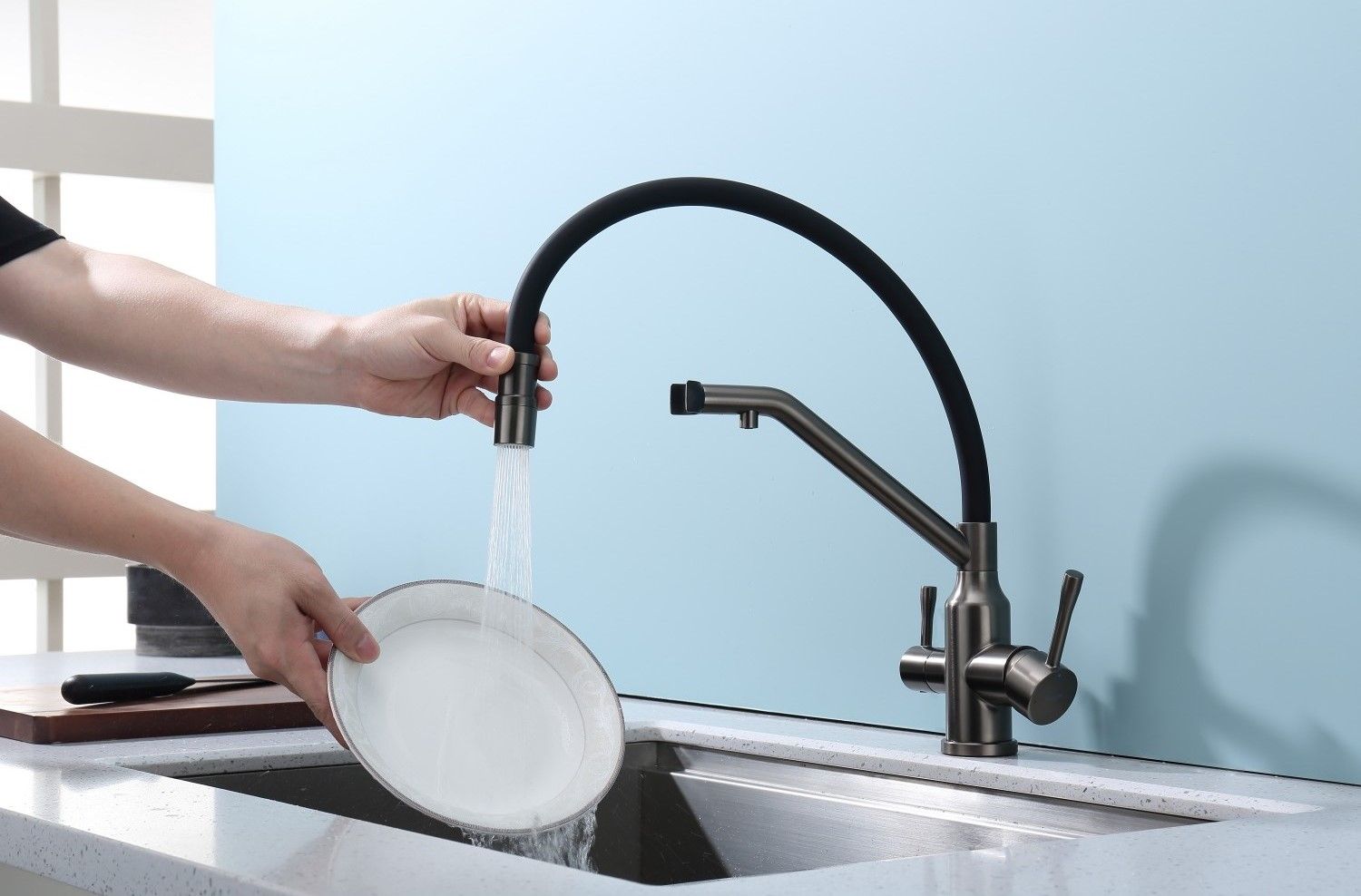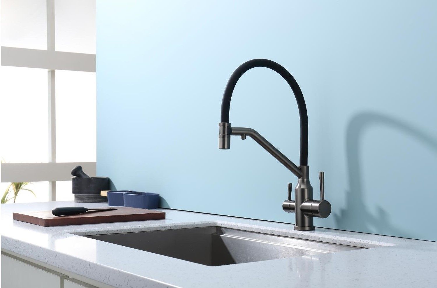 Смеситель для кухни со съемным изливом на магните и подключением фильтра питьевой воды. Гибкий излив белого цвета. Крепление на усиленной гайке. Подводка длиной 55 см имеет латунные гайки.Гарантия на смеситель 7 лет и 2 года на покрытие!