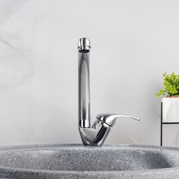 Классический однорычажный смеситель для кухни с высоким поворотным изливом обладает лаконичной ручкой регулировки температуры воды, отлично подойдет для оснащения любой раковины.
