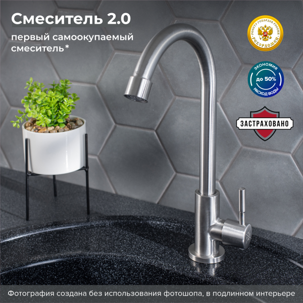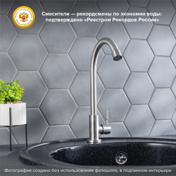 Одноручковый смеситель для кухни из нержавеющей стали с высоким изливом прекрасно подойдет для мойки любого размера.