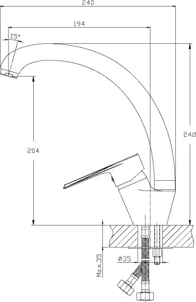 Смеситель для кухни Rossinka RS28-23 с поворотным изливом. Пластиковый аэратор с функцией легкой очистки, керамический картридж 35 мм, гибкая подводка 40 см - 2 шт., присоединительная группа для горизонтального крепления, металлическая рукоятка