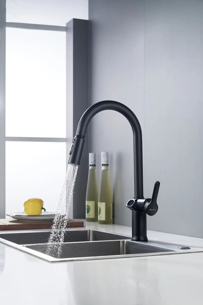 Инновации в стильной оболочке. Смеситель KN-100/BL с индикатором температуры и эффектным матовым черным покрытием идеально подойдет для современной кухни. Смеситель для кухни Knotlor KN-100/BL INSPIRATION — это идеальное сочетание современного дизайна и практичности для вашей кухни. Изготовленный из высококачественной латуни, он не только выглядит стильно и элегантно, но и отличается исключительной прочностью и долговечностью. Рычажное управление с керамическим картриджем обеспечивает плавное и точное регулирование температуры и напора воды. Особенностью модели является выдвижной излив с тремя режимами работы: стандартная струя через аэратор для повседневного использования, режим “душ” для удобного мытья овощей и фруктов, а также две мощные струи-распылители для эффективной очистки сильнозагрязнённых поверхностей. Смеситель комплектуется гибкой подводкой со стандартным подключением 1/2". Приобретайте смеситель для кухни Knotlor KN-100/BL INSPIRATION, который станет незаменимым помощником на вашей кухне, сочетая в себе функциональность, удобство использования и современный внешний вид.
