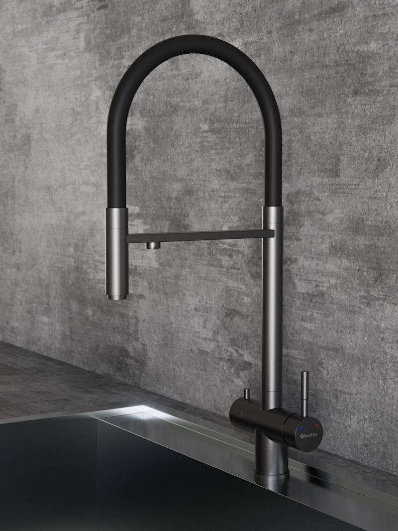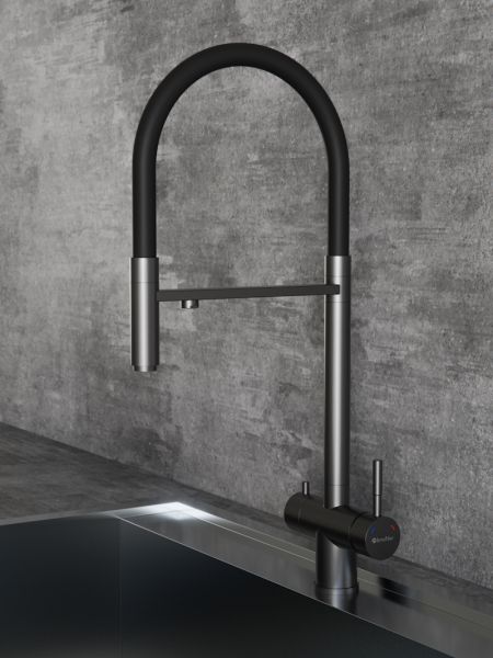 Смеситель из вороненой стали с гибким изливом и фильтром для воды. Надежность и стиль в одной модели. Смеситель для кухонной мойки Knotlor SS-16/GM INFINITY - идеальное решение для вашей кухни! Изготовленный из нержавеющей стали, он гарантирует долговечность и стабильность на многие годы. Гибкий поворотный силиконовый излив обеспечивает максимальный комфорт при использовании, позволяя легко настроить струю воды под ваши нужды. Одним из ключевых преимуществ смесителя является возможность подключения фильтра для воды. Теперь у вас всегда будет доступ к чистой и свежей воде прямо из вашей мойки. Отдельный рычаг для подачи чистой воды от фильтра: подключается через отдельный шланг к системе фильтрации водопроводной воды, например марки Гейзер, Барьер и другие. Фильтр приобретается отдельно. Дополнительный излив служит не только для подачи фильтрованной воды, но и как держатель для гибкого излива, когда тот не используется, что добавляет удобства в повседневном использовании. Керамический картридж и рычажное управление обеспечивают плавное и точное регулирование температуры воды, а также экономию водных ресурсов. Стильный и функциональный дизайн гармонично впишется в интерьер любой кухни, создавая удобство и комфорт при использовании смесителя. Не откладывайте покупку кухонного смесителя Knotlor SS-16/GM INFINITY - сделайте свою кухню еще более удобной и современной уже сегодня!