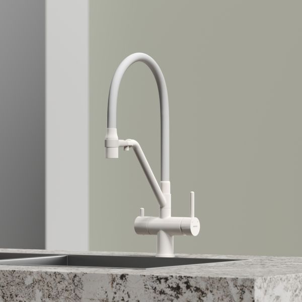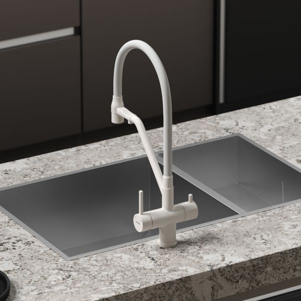 Смеситель для кухни SANCOS Dora с гибким изливом и возможностью подключения фильтра для воды, цвет матовый белый, арт. SC4003MWС возможностью регулировки температуры водыАэратор, гибкая подводка, ключ и крепления для монтажа