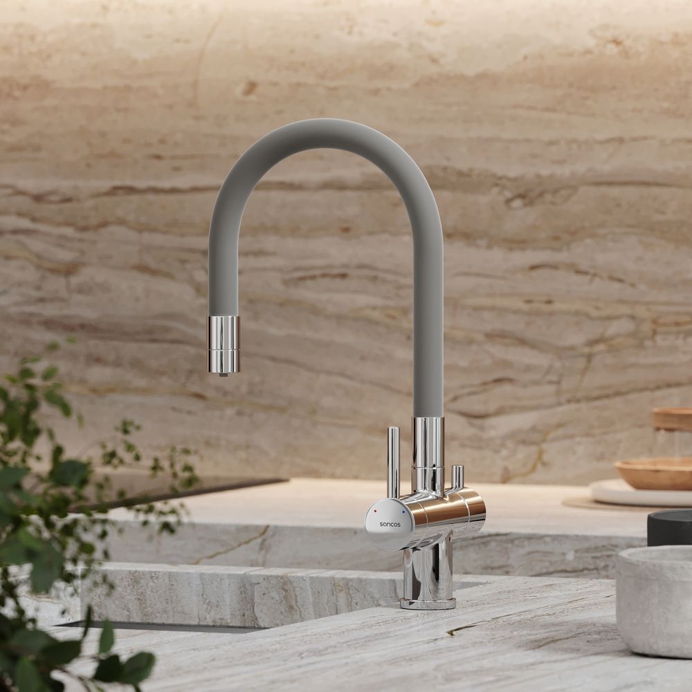 Смеситель для кухни SANCOS Lucia с гибким изливом и возможностью подключения фильтра для воды, цвет хром, арт. SC4004CHС возможностью регулировки температуры водыАэратор, гибкая подводка, ключ и крепления для монтажа