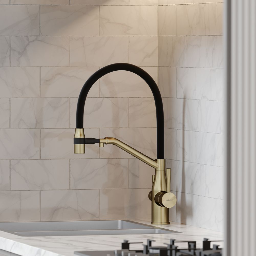 Смеситель для кухни SANCOS Orta с гибким изливом и возможностью подключения фильтра для воды, цвет брашированное золото, арт. SC4008BGФункция "Холодный старт" - при включении смесителя активируется холодной поток, для экономии горячей водыАэратор, гибкая подводка, ключ и крепления для монтажа