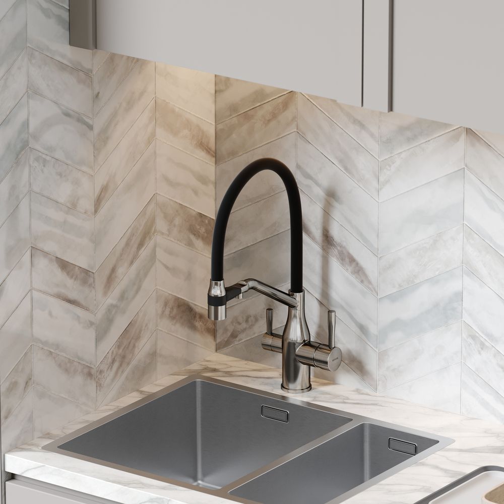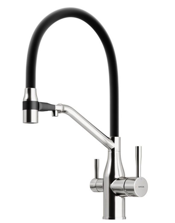 Смеситель для кухни SANCOS Orta с гибким изливом и возможностью подключения фильтра для воды, цвет брашированный никель, арт. SC4008BNФункция "Холодный старт" - при включении смесителя активируется холодной поток, для экономии горячей водыАэратор, гибкая подводка, ключ и крепления для монтажа