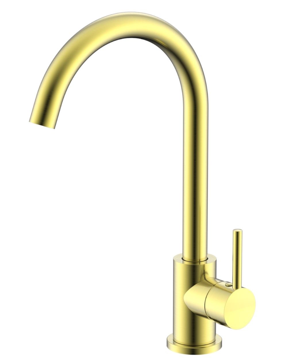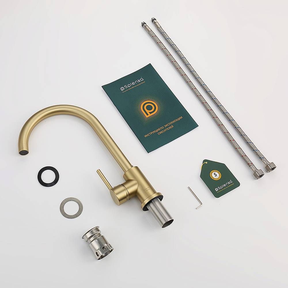 Смеситель для кухни Splenka S201.40.03. Цвет: сатин золотой. Смеситель для кухни сочетает в себе удобную конструкцию, простоту в установке, универсальный современный дизайн и доступную цену за высокое качество.Смеситель превосходно дополнит интерьер любой кухни. В набор входит гибкая подводка размером 1/2". Монтаж на гайку. Тип подводки – гибкий. Обслуживание одного потребителя. Без температурных ограничений. Монтаж на одно отверстие.