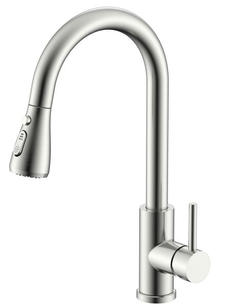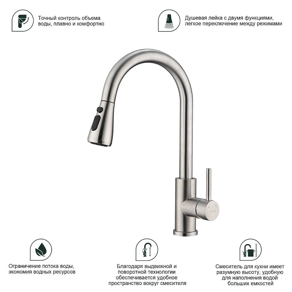 Смеситель для кухни с выдвижным изливом Splenka S203.49.05. Цвет: сатин. Смеситель для кухни с выдвижным изливом из нержавеющей стали. Излив смесителя оснащен аэратором, что обеспечивает экономичный расход воды. Излив поворотный и выдвижной. Механизм смесителя: керамический картридж. Управление рычажное. Подводка гибкая 1/2. Режимы лейки: 2. Данная модель отличается своей долговечностью и хорошим качеством.