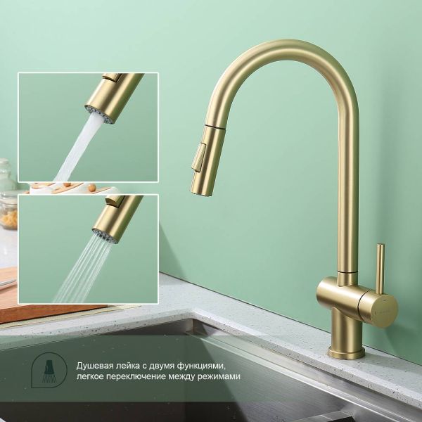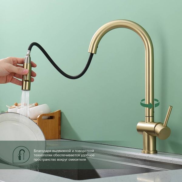 Смеситель для кухни Splenka S204.49.03 с выдвижным изливом золотой сатин