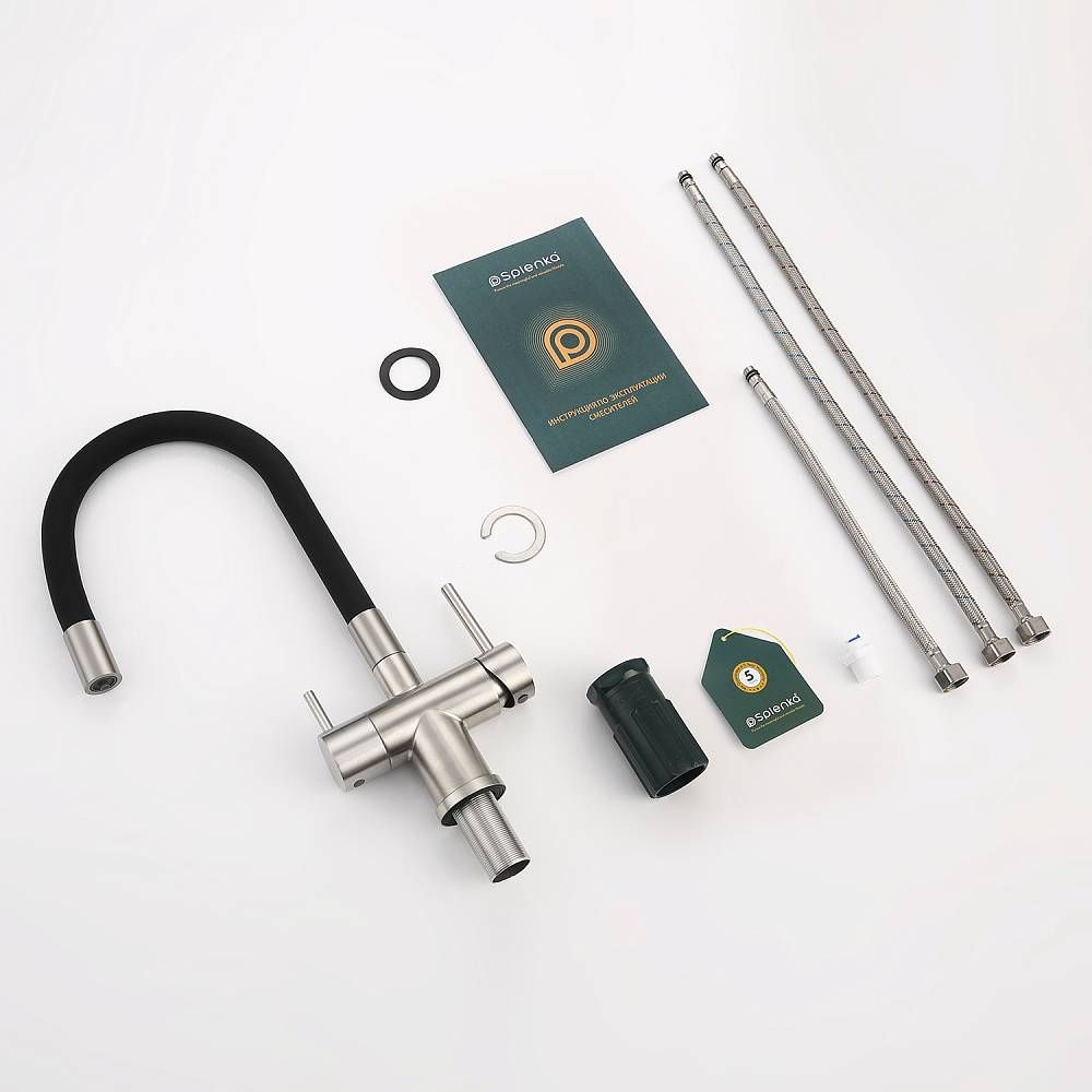 Смеситель для кухни с подключением к фильтру питьевой воды Splenka S70.64.05. Цвет: сатин. Гибкая подводка 50 см идет в комплекте. Благодаря грамотно разработанной конструкции, прибор отлично справляется с регулированием температуры и напора потоков воды. Однорычажные смесители максимально удобны при эксплуатации, всего одним движением руки можно закрыть или открыть воду, имеют стильный внешний вид, а также комфортность в использовании. Гарантия 5 лет.
