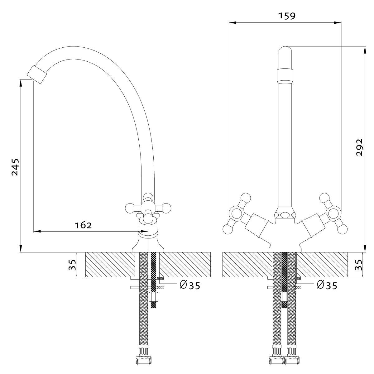 Смеситель Rossinka H02-71 для кухни. Пластиковый аэратор с функцией легкой очистки. Керамические вентильные головки, гибкая подводка 30 см – 2 шт. Присоединительная группа для горизонтального крепления
