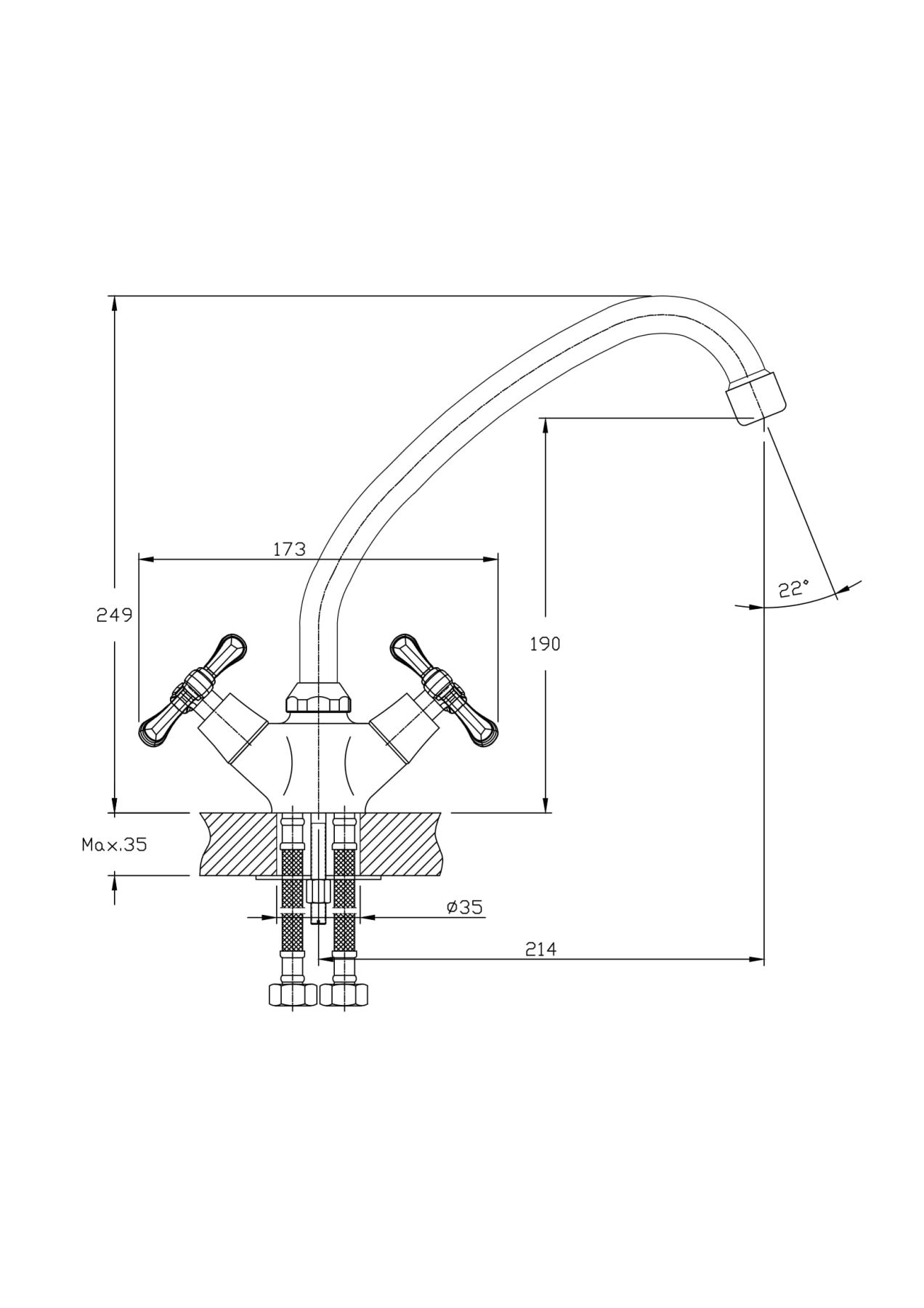 Смеситель для кухни RUSH арт. BI7650-22 с высоким поворотным изливом с металлической ручкой из коллекции Bianki изготовлен из высококачественной латуни и имеет вентильное управление. В смеситель установлены кран-буксы (RSH502) с керамическими пластинами. Высота смесителя 249 мм. Излив поворотный 214 мм. Высота излива до аэратора 190 мм. Аэратор изготовлен из пластика с нержавеющим корпусом, угол наклона - 22 гр. В комплекте гибкая подводка с латунными гайками 35см - 2 шт, универсальная присоединительная группа (шпилька-2шт), индивидуальный пакет, паспорт, гарантийный талон.