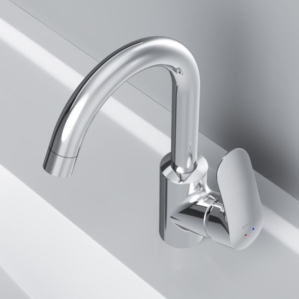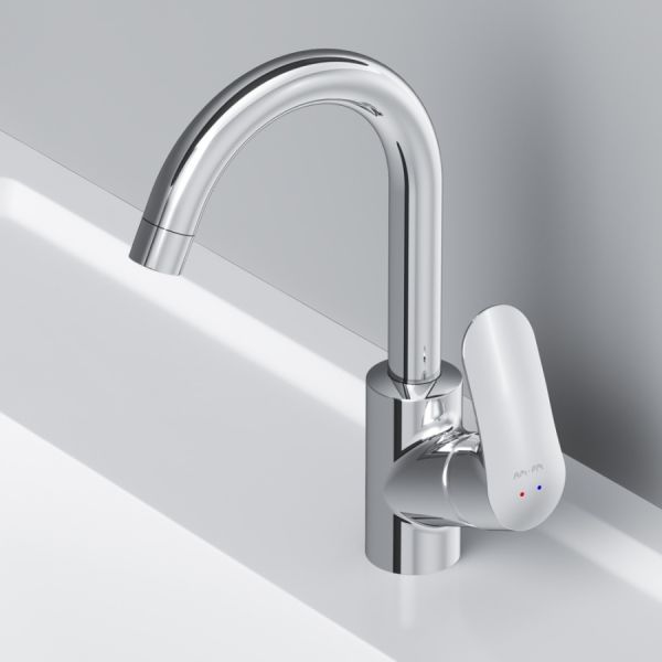 вид и идеально подойдет для раковины с глубокой чашей, а благодаря обширной зоне движения ручки управлять температурой воды еще проще.