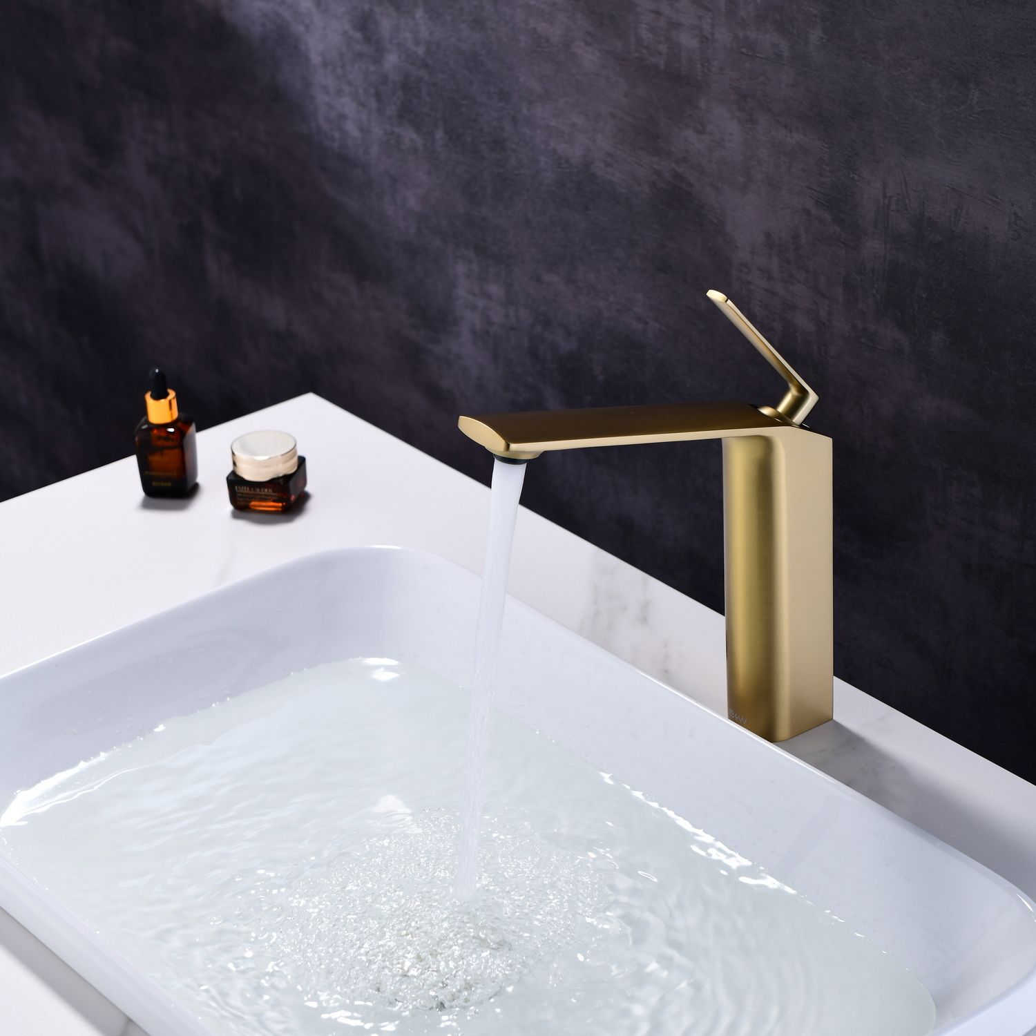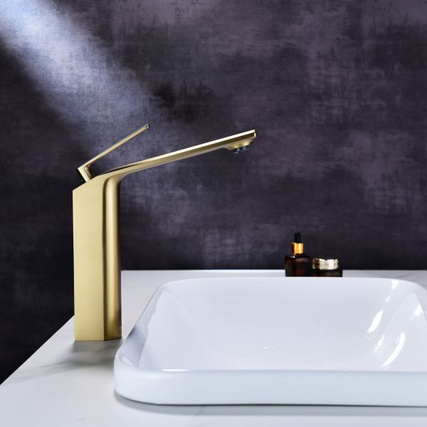 Смеситель для накладной раковины датского производителя Black&White в цвете брашированное золото .Продукт изготовлен из сантехнической латуни – безопасного для здоровья сплава, обработанный  обработанный PWD покрытием. Управление давлением и температурой воды происходит с помощью керамического картриджа повышенной пропускной способности.Высота смесителя составляет 22 см., что оптимально для накладных и полувстраиваемых раковин, а излив с возвышением позволяет комфортно мыть руки и минимизировать количество брызг.