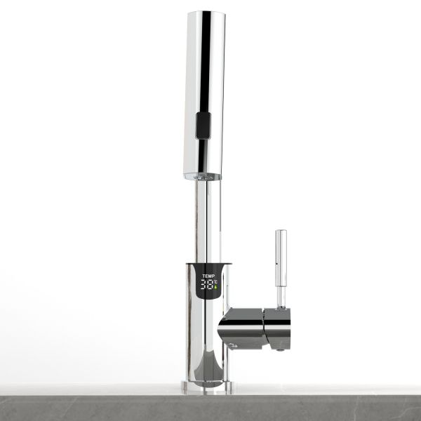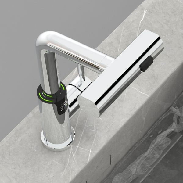Смеситель для раковины датского производителя Black&White в цвете хром. В корпусе изделия прослеживаются нотки классических форм и современного стиля. Изготавливается из сантехнической латуни для увеличенного запаса прочности и исключения вероятности появление коррозии. Управление потоком воды осуществляется с помощью керамического картриджа повышенной пропускной способности. Инновационным решением можно отметить электронное табло, расположенное в нижней части корпуса, на которое выводится показание температуры воды с подсветкой красного, зеленого и синего цвета. В данном продукте реализован многофункциональный излив с возможностью настройки высоты и длинны с помощью вытяжного шланга. Аэратор смесителя оборудован несколькими видами подачи воды, которые переключаются с помощью кнопки расположенной сверху корпуса.