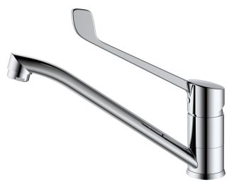 S08.42 Смеситель для раковины/мойки с хирургической ручкой локтевой, изготовлен из латуни, керамический картридж 35 мм, хром покрытие. Подводка 50 см, на усиленной гайке. Гарантия 5 лет.