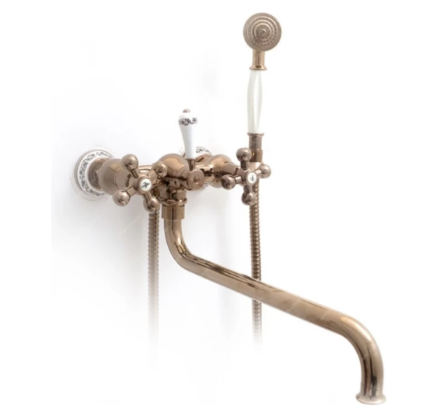Смеситель для ванны Gappo Tubin G2265-3 - оригинальная двухвентильная модель с поворотным изливом 35 см. Душевая лейка в комплекте. Цвет - красное золото с декором.