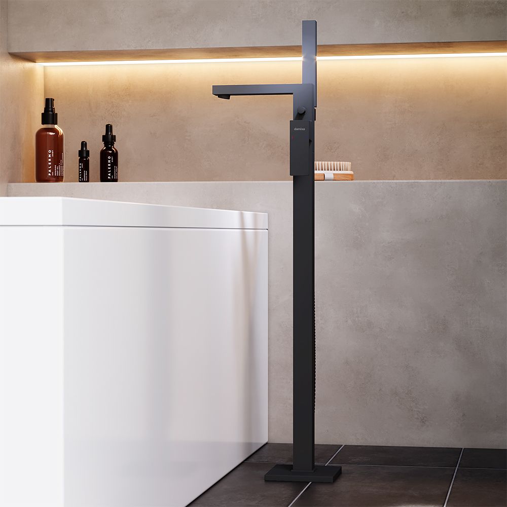 Смеситель для ванны и душа Damixa Gala 535000300 черныйКорпус смесителя 1 шт; излив 1 шт. ; кронштейн крепления 1 шт. ; комплект крепежный 1 шт. ; ручной душ 1 шт. ; шланг 1 шт. ; гибкая подводка 2 шт. ; декоративная тарелка 1 шт. ; инструкция . Черный матовый, высокий отдельностоящий смеситель для отдельностоящей ванны и ручного душа, оригинальный дизайн строгие прямоугольные формы, ручной душ прямоугольной формы, управление одной ручкой