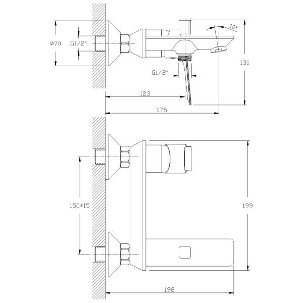 Смеситель для ванны Rossinka RS27-31 с монолитным изливом. пластиковый аэратор с функцией легкой очистки, керамический картридж 35 мм, кнопочный переключатель, аксессуары в комплекте (шланг 1,5 м, настенное крепление, 5-функциональная лейка с функцией легкой очистки), присоединительная группа (эксцентрики с отражателями) для вертикального крепления, металлическая рукоятка