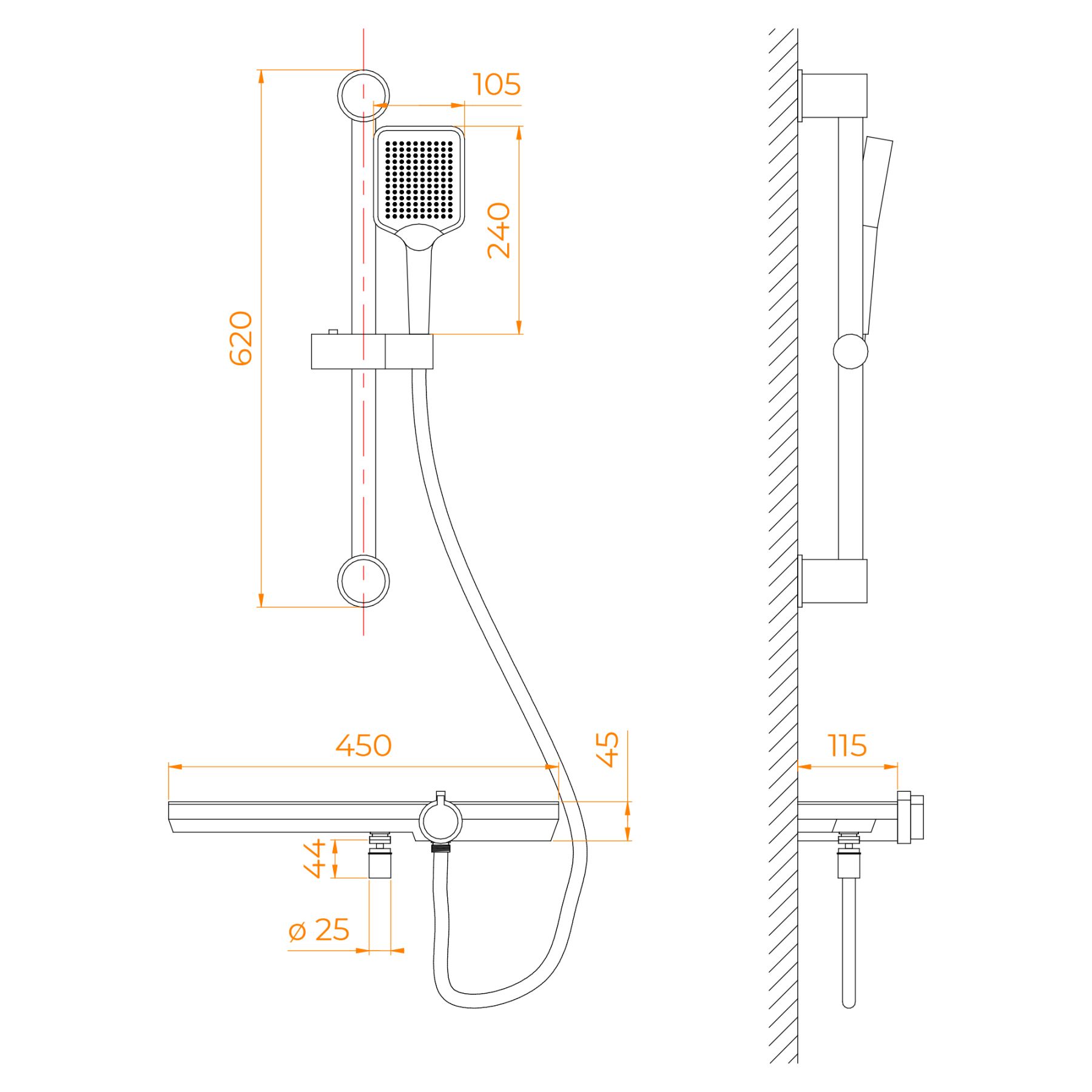 • Металлическая штанга с регулировкой высоты держателя ручного душа;