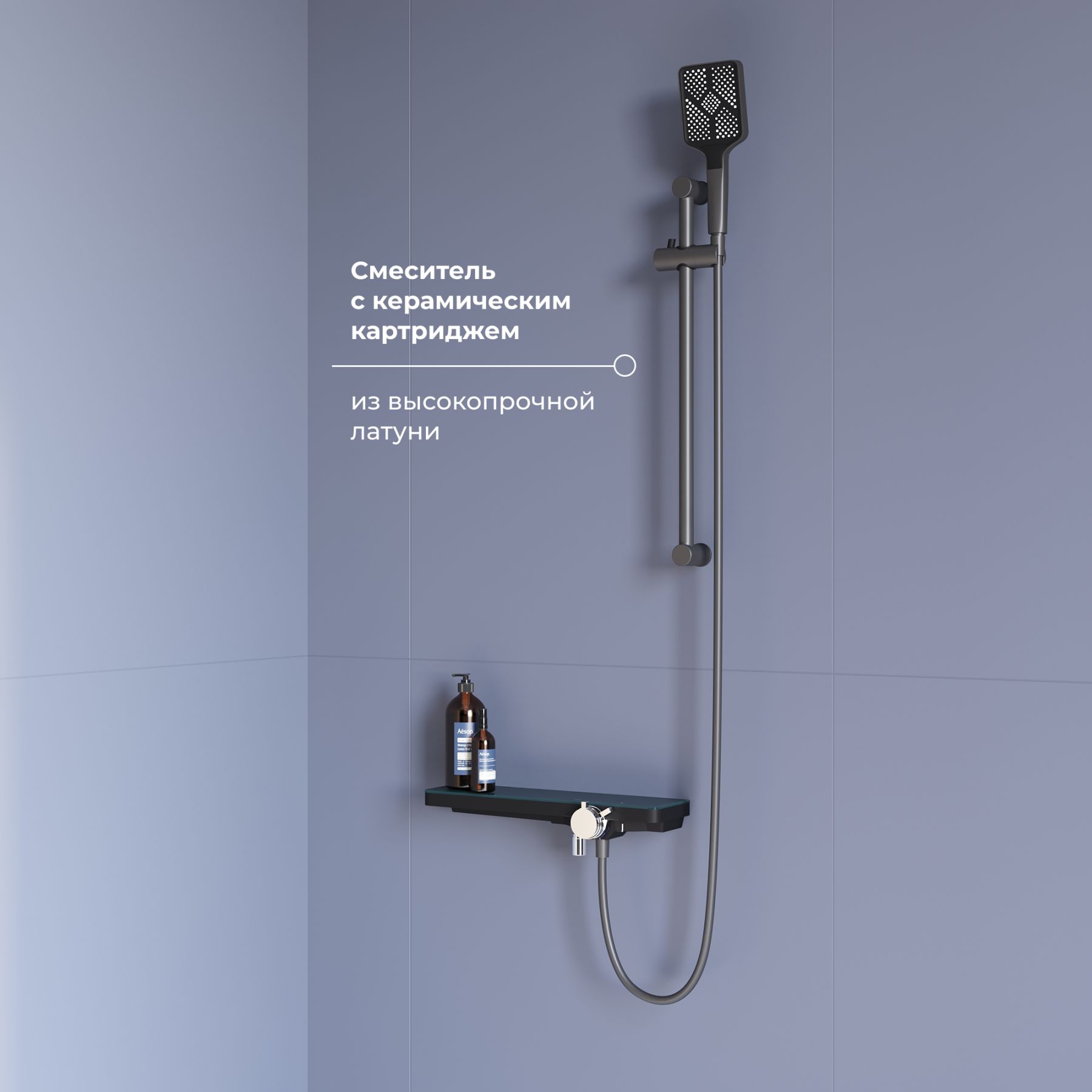 В футуристическом дизайне: корпус изделий выполнен в виде вместительной и удобной полки для душевых принадлежностей, а наличие удлиненного поворотного излива с шарнирным соединением позволяет регулировать направление воды, для максимального комфорта в процессе использования.