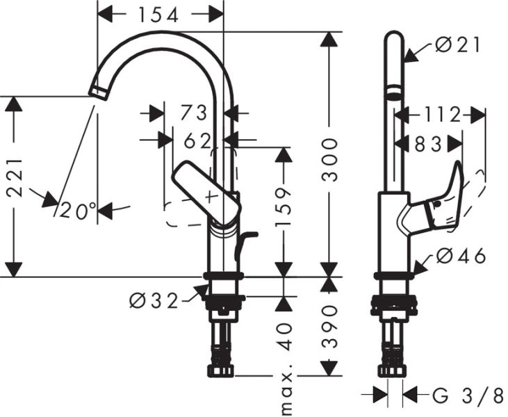 • Высота смесителя: