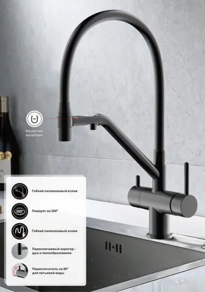 • Излив: поворотный, силиконовый гибкий, цвет серый