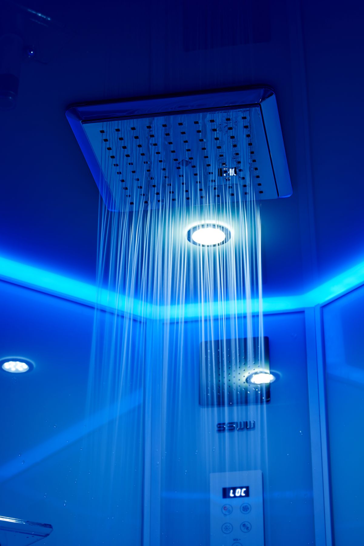 Центральная панель – белое стекло с накладкой из нержавеющей стали с силиконовыми форсунками и смесителем из латуни;