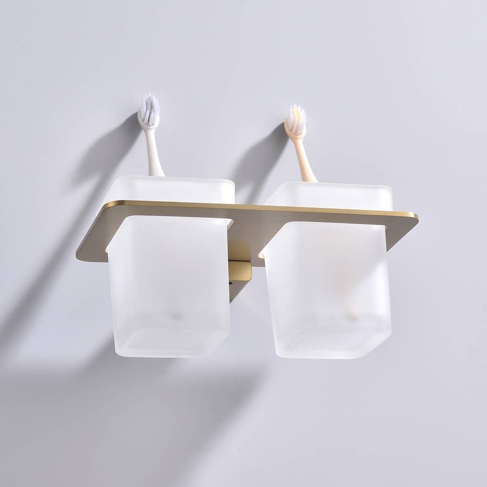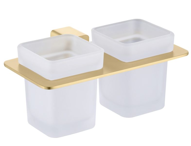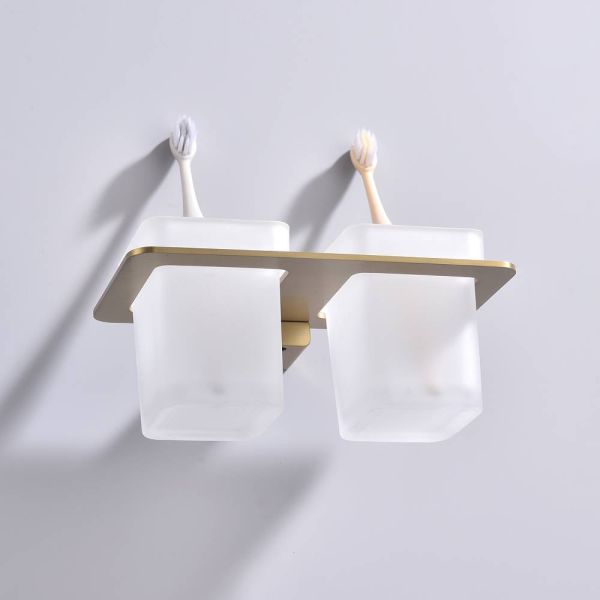 Дизайн: Держатель выполнен в цвете золотой сатин, что придает ему современный и элегантный вид. Лаконичный дизайн стаканов гармонично сочетается с любым интерьером ванной комнаты.