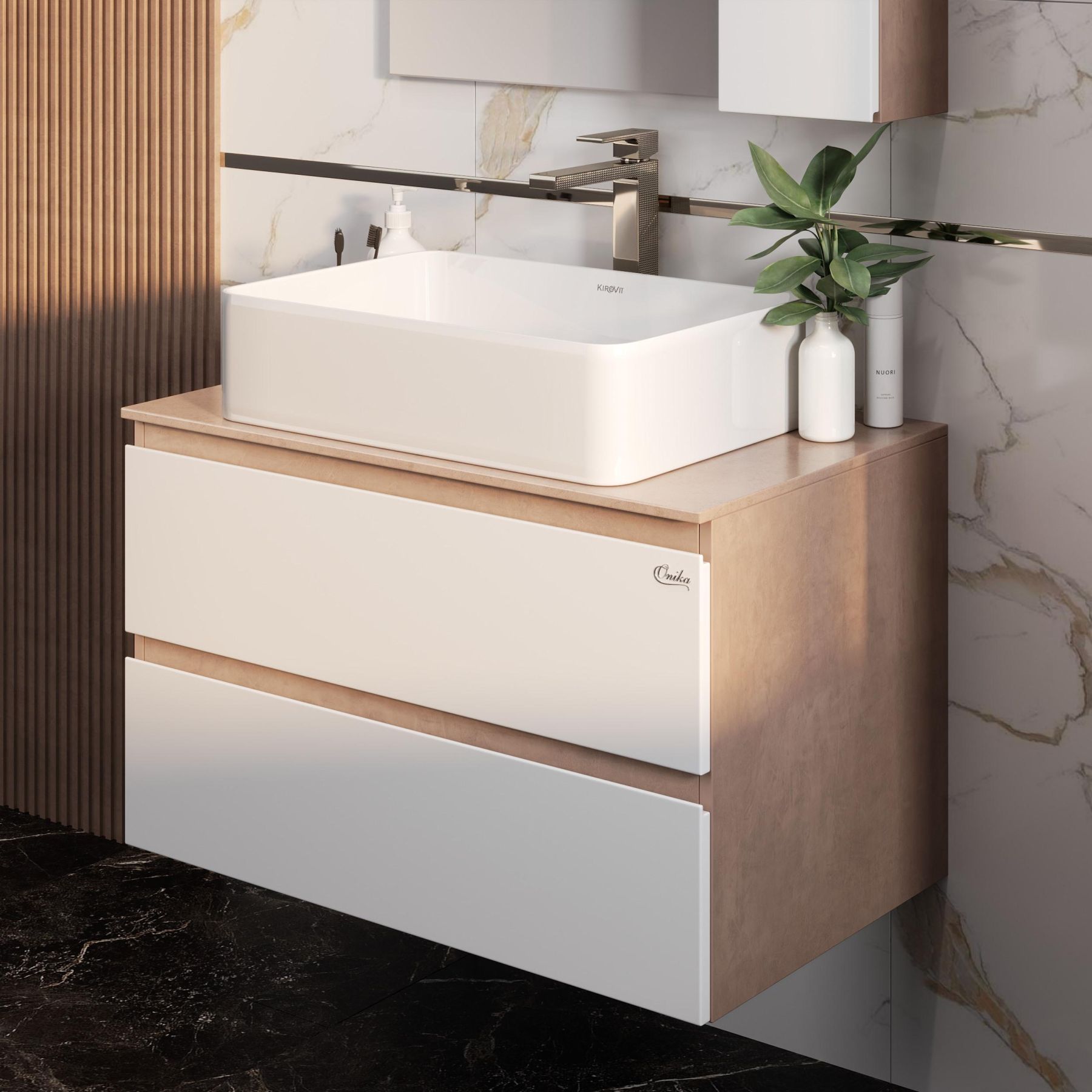 Столешница к тумбе Onika АЛЕСТА 80 - неотъемлемая часть самой тумбы: она одновременной является верхней поверхностью тумбы и подставкой для раковины. Столешница сделана из керамогранита, обладающего отличными показателями долговечности, устойчивости к ударам и царапинам, химическим веществам и перепадам температуры, а так же высоким уровнем экологичности и гигиеничность материала.