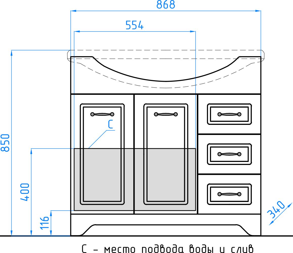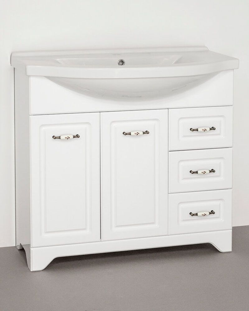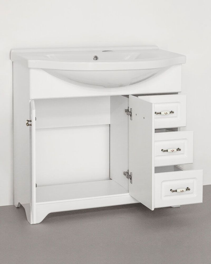 Тумба напольная бренда "Style Line" коллекции "Олеандр-2" классического дизайна, декорированная ручками с керамическими вставками "под бронзу" с изящным рисунком. Направляющие полного выдвижения Hettich; сборка изделия с помощью эксцентриковых стяжек Hafele; все материалы полностью влагостойкие. Данная тумба предусматривает открытую подводку воды