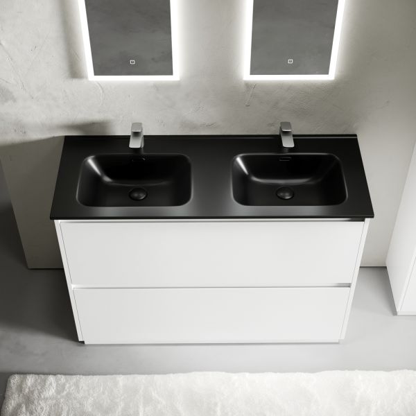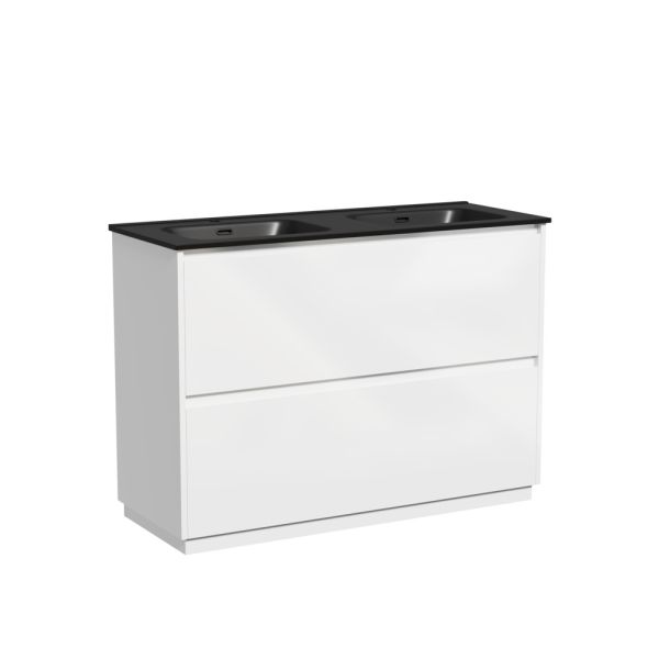 Тумба напольная Libra c двумя ящиками с доводчиками скрытого монтажа, с системой плавного закрывания и с ручкой по всей длине ящика. Каркас и фасад тумбы выполнен из МДФ, покрытие эмаль, цвет белый глянец. Основание тумбы имеет ножки c регулировкой высоты до10 мм для компенсации возможной неровности напольного покрытия. Внутреннее пространство тумбы выполнено из надежного ЛДСП серого цвета. Размер 1190х450х840, артикул LB120F-2W