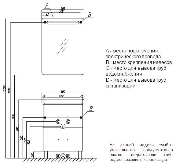 • Дополнительно организовано нижнее подключение труб водоснабжения и канализации