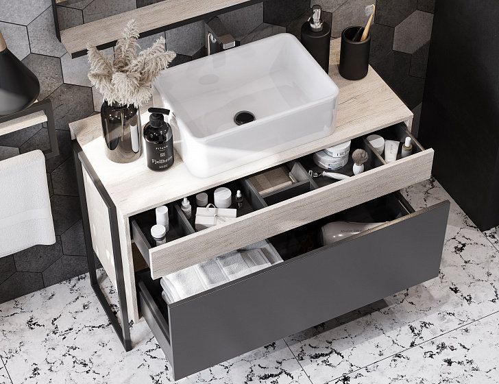 Модуль 100 коллекции Лофт Урбан функционально состоит из двух ящиков полного выдвижения. Верхний ящик тумбы комплектуется внутренней организацией пространства: в нем очень удобно хранить небольшие аксессуары и принадлежности. Вместительный нижний высокий ящик подойдет для более крупных предметов. Функция полного выдвижения ящиков и система открывания push-to-open делают использование тумбы особенно комфортным. Подвесной модуль может комплектоваться различными по размеру и дизайну металлическими черными опорами, высокими и низкими, которые крепятся непосредственно под модуль, кроме того, доступен вариант установки модуля и без опор. Корпус тумбы выполнен из влагостойкой ламинированной ДСП в цвете дуб орегон с текстурой натурального дерева, выгодно подчеркнутым фасадами из МДФ в пленке антрацит с эффектом soft touch.