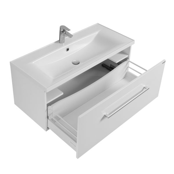 В комплектацию тумбы дополнительно включен сифон (производство Финляндия). Размер сифона подобран специально под параметры тумбы. Тумба для комплекта Акватон Мадрид 100 белая с ящиком не только восхитительное украшение для ванной комнаты, но и идеальное функциональное решение любого санузла. Подвесной способ установки дает возможность не только визуально увеличить пространство, но и обеспечивает быстрый и удобный доступ для уборки.Компания Акватон использует при производстве высококачественные водоотталкивающие материалы (ДСП), соответствующие всем необходимым требованиям безопасности. Коллекция Мадрид выполнена в эксклюзивном дизайнерском решении в лучших традициях современного стиля. Белый, основной цвет исполнения Акватон Мадрид, безупречно впишется в любой дизайн проект. Тумба под раковину предусматривает удобную и вместительную систему хранения, состоящую из ящиков. Качественные доводчики позволяют обеспечить мягкое и тихое закрывание. Важные габариты изделия: ширина 99.7 см, глубина 44.1 см, высота 40 см.Россия родина бренда Акватон, вся продукция производится со строгим соблюдением всех стандартов, благодаря чему можно быть абсолютно уверенным в надежности и высоком качестве. Тумба для комплекта Акватон Мадрид 100 белая с ящиком создаст уют и комфорт в любом дизайнерском решении, и ванная комната обретет неповторимый элемент интерьера.