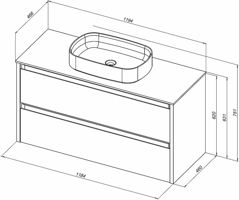 Габариты корпуса тумбы (ШхВхГ): 1184х620х460 мм.