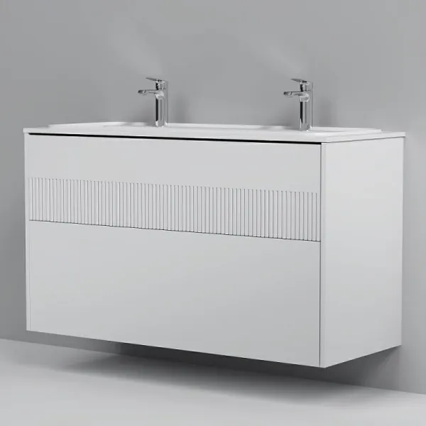 Дополните покупку тумбы уникальной широкой раковиной, интегрированной со столешницей. Раковина позволяет устанавливать два смесителя. Дизайн разработан немецкой студией Design3. Раковина выполнена из литьевого мрамора. Матовая поверхность раковины придает интерьеру ощущение уюта и комфорта. Размер раковины (Ш/Г/В): 1208x492x160 мм. Цвет раковины - белый.