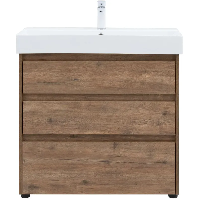 Тумба под раковину Aquanet Nova Lite 85 в рустикальном исполнении — идеальный вариант для дополнения ванной комнаты в любом из современных стилей. Лаконичный дизайн с претензией на натуральность позволяет освежить санузел смелым решением. Компактные размеры 820*736*435 мм подойдут как для малых помещений, так и для просторных. Напольная модель оснащена ножками и тремя выдвижными шкафами. Пространство внутри организовано для хранения вещей и бытовой химии с учетом коммуникаций для водоотведения. Корпус и фасад мебели изготовлены из влагостойкого ЛДСП, который препятствует образованию плесени и грибка при длительном взаимодействии с водой и влажным воздухом. Выдвижные шкафы оснащены механизмом доведения, что обеспечивает плавное закрытие. В комплект к тумбе можно купить подходящую по размерам керамическую раковину от Sanovit, например модель Slim Synergy, которая легко подсоединяется к мебели.