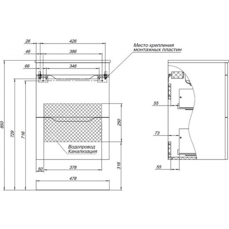 За нижним ящиком предусмотрено место для подводки коммуникаций. Тумбу можно установить на универсальные опоры высотой 200 мм.