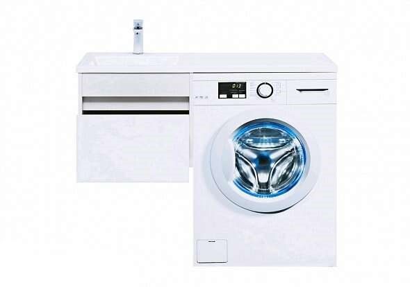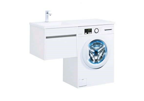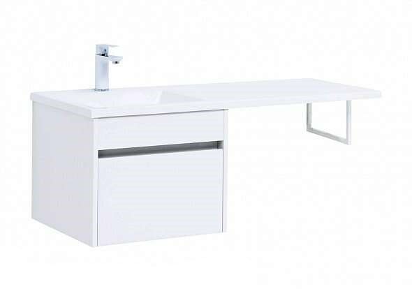Тумба под раковину Aquanet Токио 110 (подвесная, 1 ящик) белого цвета представляет новый формат тумб производства Aquanet. Раковина из литьевого мрамора имеет длинную платформу, которая выходит далеко за пределы тумбы. Она предназначена для того, чтобы установить с правой стороны от тумбы стиральную машину. Платформа имеет такую длину, которая позволит спрятать под нее машинку средних размеров с фронтальной загрузкой. Корпус тумбы выполнен из влагостойкого ЛДСП, а фасад – из МДФ с покрытием эмалью. В подвесной тумбе шириной 480 мм место хранения предусмотрено в выдвижном ящике, оборудованном доводчиками, чтобы ход ящика при открывании/закрывании был плавным и без неприятных звуков. Тумбу можно использовать и без соседства со стиральной машиной, а свободное пространство под платформой раковины занять подкатной тумбой, полочками для полотенец или столиком. Тумба предлагается без раковины
