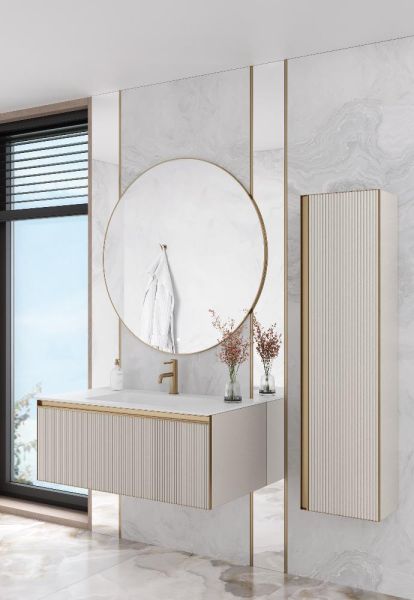 Главной особенностью коллекции являются обрамления фасадов из алюминия в самых трендовых цветах: графит, матовое золото, матовый черный и серебро. Эти обрамления идеально дополняют сантехнику в ванной комнате.