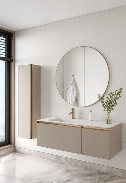 Главной особенностью коллекции являются обрамления фасадов из алюминия в самых трендовых цветах: графит, матовое золото, матовый черный и серебро. Эти обрамления идеально дополняют сантехнику в ванной комнате.