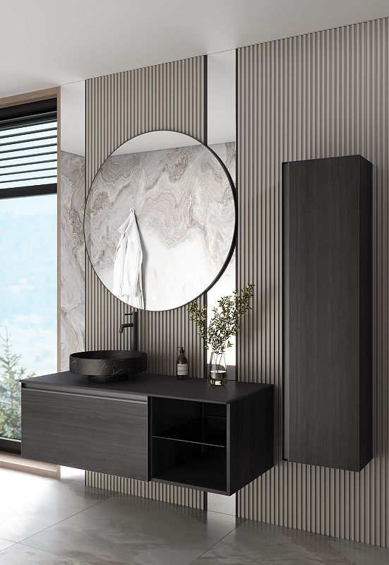 Главной особенностью коллекции являются обрамления фасадов из алюминия в самых трендовых цветах: графит, матовое золото, матовый черный и серебро. Эти обрамления идеально дополняют сантехнику в ванной комнате.