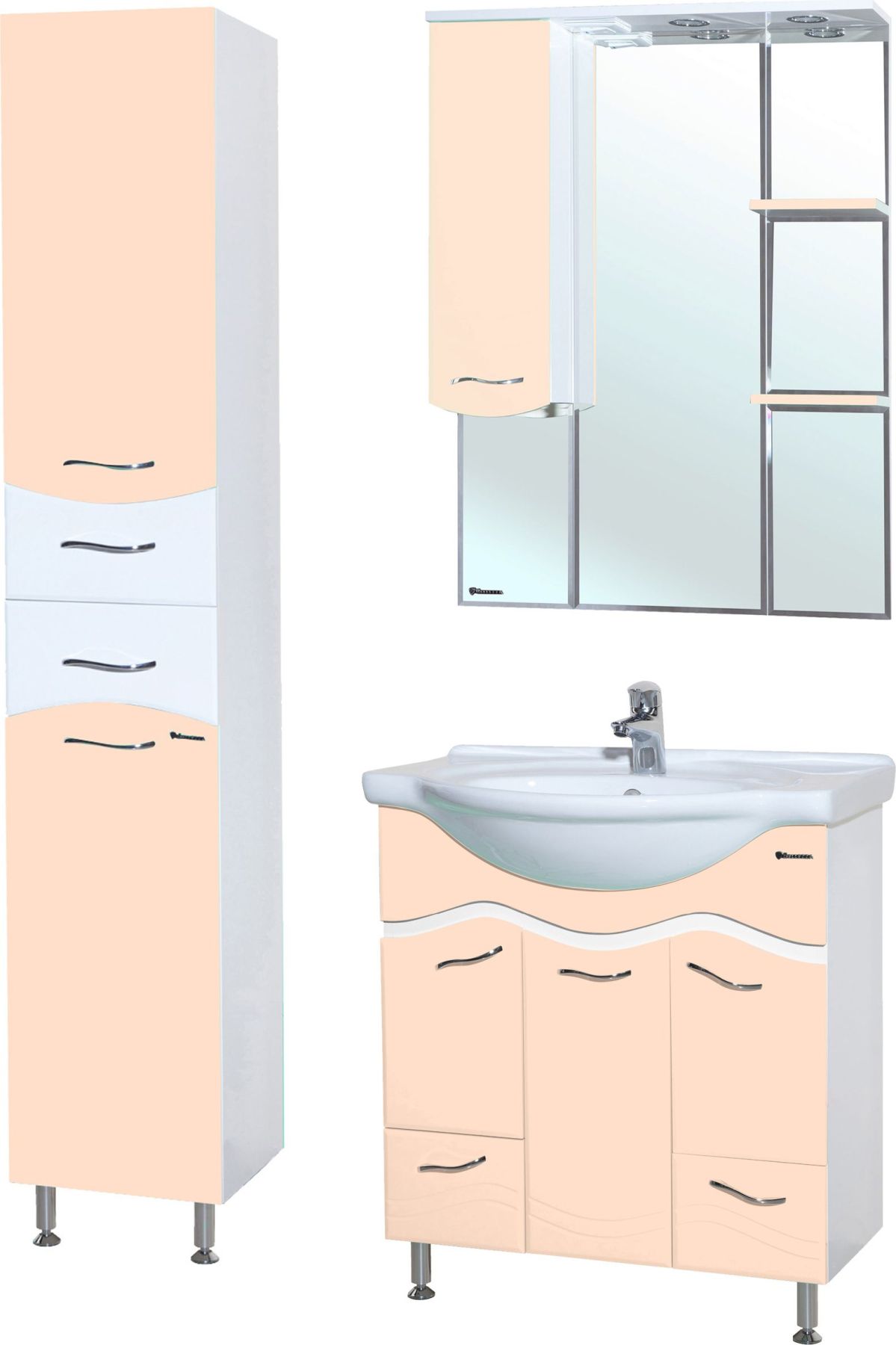 Тумба Bellezza Мари шириной 85 см в бежевом глянцевом исполнении — это гармоничное сочетание современного дизайна, практичности и продуманной системы хранения. Модель с тремя распашными дверцами и двумя выдвижными ящиками предлагает максимум функциональности для ванных комнат среднего и большого размера, сохраняя эстетическую целостность и уют.