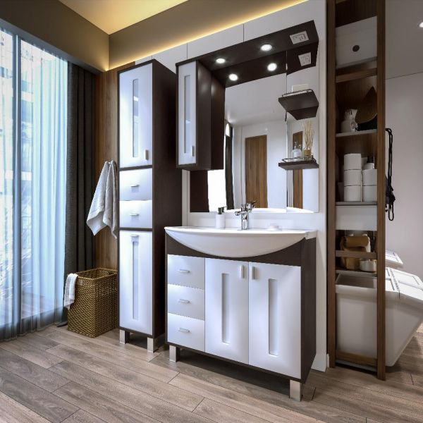 Удобная система хранения позволяет размещать все необходимое для гигиенических процедур, а её продуманные размеры отлично вписываются даже в небольшие помещения. Стильные ручки и элегантные фасады придают тумбе особый шарм, а разнообразие цветовых решений позволит выбрать модель, соответствующую любому интерьеру – от классического до модерн.