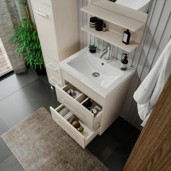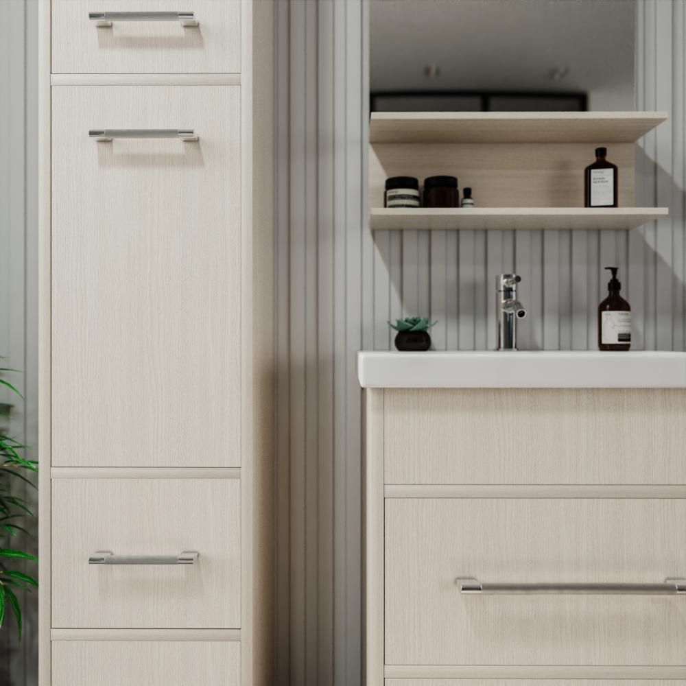 Удобная система хранения позволяет размещать все необходимое для гигиенических процедур, а её продуманные размеры отлично вписываются даже в небольшие помещения. Стильные ручки и элегантные фасады придают тумбе особый шарм, а разнообразие цветовых решений позволит выбрать модель, соответствующую любому интерьеру – от классического до модерн.