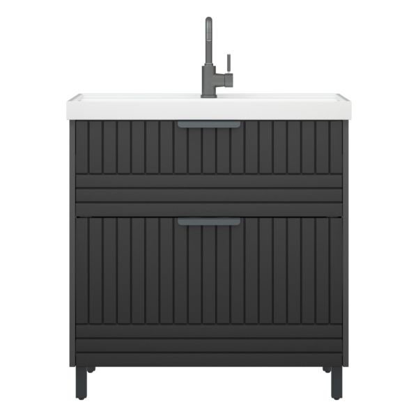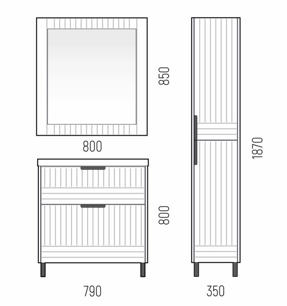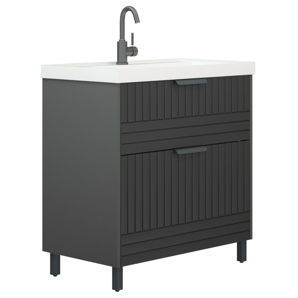 Тумба для раковины Corozo Терра 80, люкс матовый графит, SD-00001323У тумбы коллекции "Терра" 2 выдвижных ящика. Направляющие с доводчиками. Фасад и корпус выполнены из влагостойкой плиты МДФ. В комлекте 4 металлические опоры. Ручки и опоры выполнены из металла цвета "Черный муар".